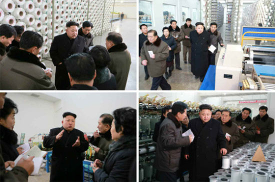 金正恩巡视了人造丝布车间和染色综合车间等工厂各处,具体了解了生产情况和产品质量。