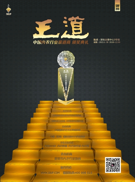 “‘王道’颁奖礼---2014-2015 siuf中国内衣行业优秀渠道商颁奖盛典”活动,无论评选本身,还是传播效果,都会有一个新的突破,将给参与者带来无与伦比的品牌价值。“王道”共设置三个奖项:区域十强代理商、全国十大王牌代理商、全国百强优秀终端店。