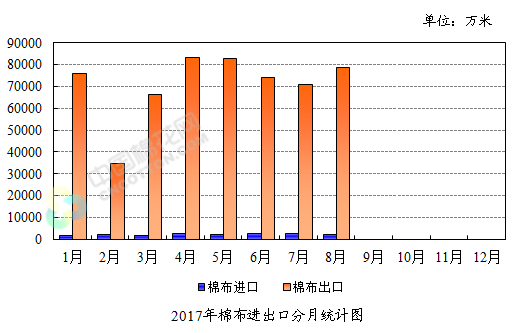 据最新统计数据显示,2017年8月,我国进口棉布0.26亿米,环比下降13.75%,同比下降21.82%;出口棉布7.92亿米,环比增长10.94%,同比下降7.43%;净出口量为7.65亿米,环比增长12.04%,同比下降6.84%。
