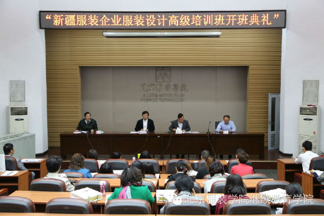 2014年10月13日上午九时,由新疆服装(服饰)行业协会主办、我校继续教育学院承办的新疆服装企业服装设计高级培训班开班仪式在科技报告厅举行。新疆维吾尔自治区经信委副主任谢青、北京服装学院副校长贾荣林、新疆服装(服饰)行业协会会长张同智、继续教育学院院长史学伟参加了开班仪式。仪式由张同智会长主持,贾荣林副校长、谢青副主任分别致辞。