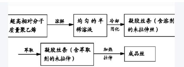 凝胶纺丝工艺包含溶胀-溶解-纺丝-萃取-多级热拉伸等工序,需控制凝固浴温度和喷丝头间距,并克服制备均匀无气泡凝胶的挑战。凝固过程中聚合物链形成物理缠结,通过超倍拉伸实现柔性链分子伸直结晶。